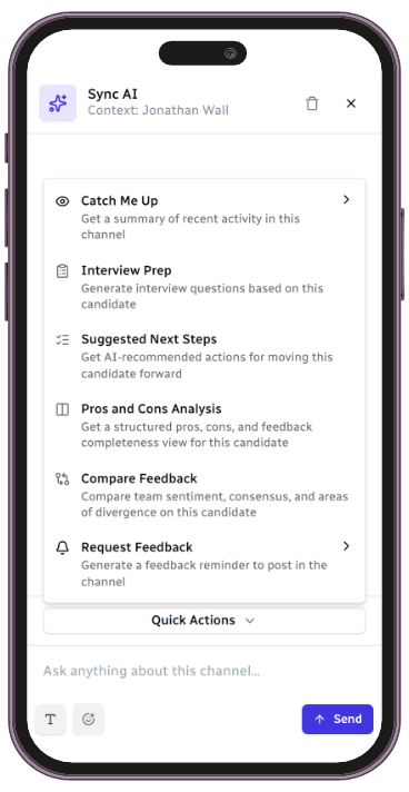 Sync2Hire isn’t designed for interview scheduling, feedback forms, approvals, or hiring records. Those belong in the ATS. Sync2Hire focuses on the everyday conversations that happen throughout the recruiting team as they align on candidates, coordinate decisions, and keep hiring moving forward.