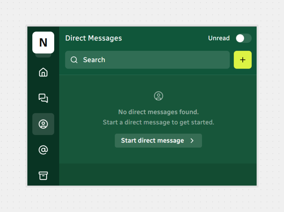 Use the Search at the top to filter existing DMs. If you don’t have one yet, you’ll see the Start direct message button in the empty state.