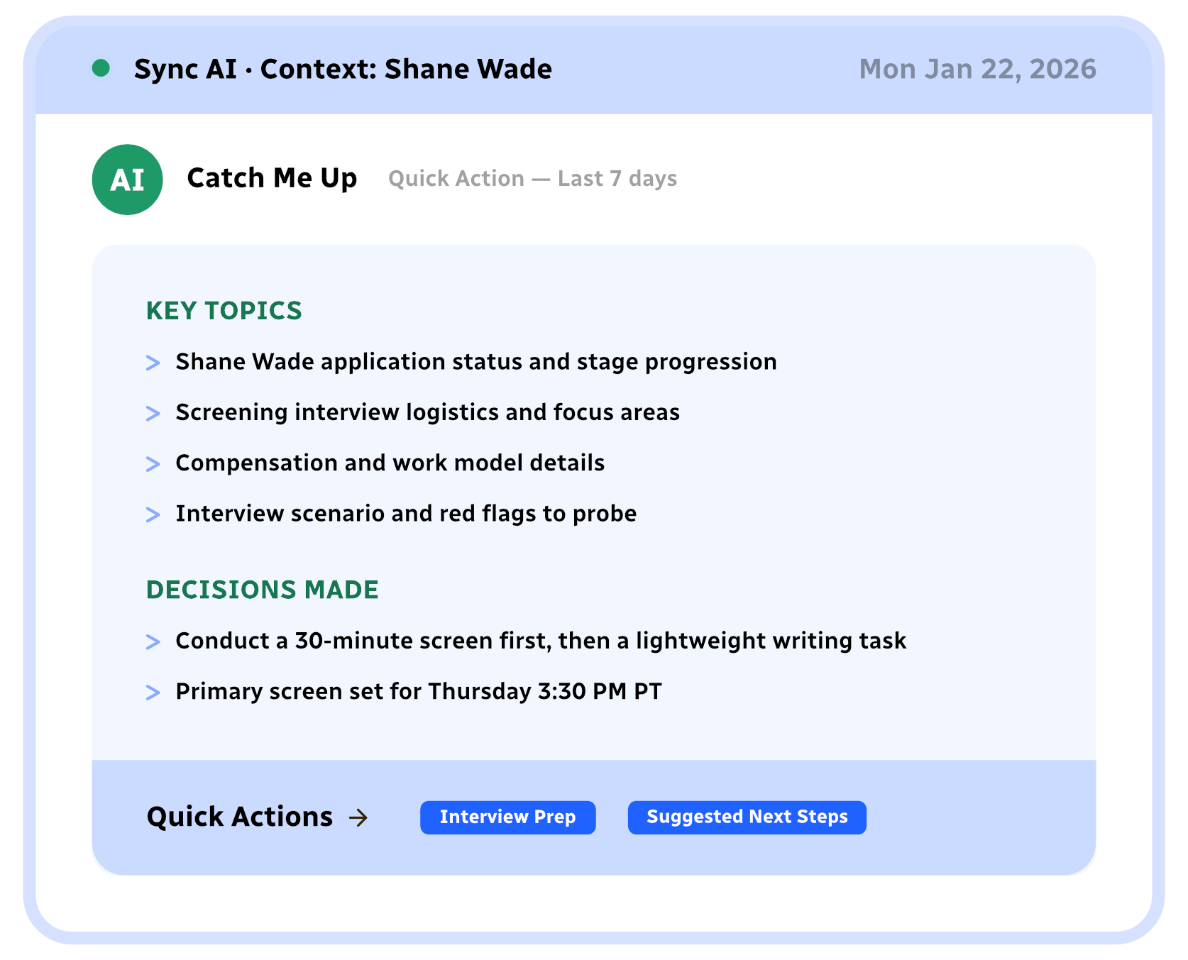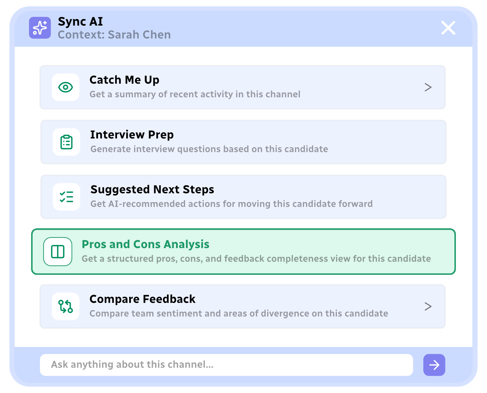 Sync AI lives inside Sync2Hire's hiring channels — where your team already discusses candidates, schedules interviews, and makes decisions. It reads that context, then gives you Catch Me Up summaries, Interview Prep briefs, Pros & Cons analyses, and more. All in one click, right where the conversation is happening.