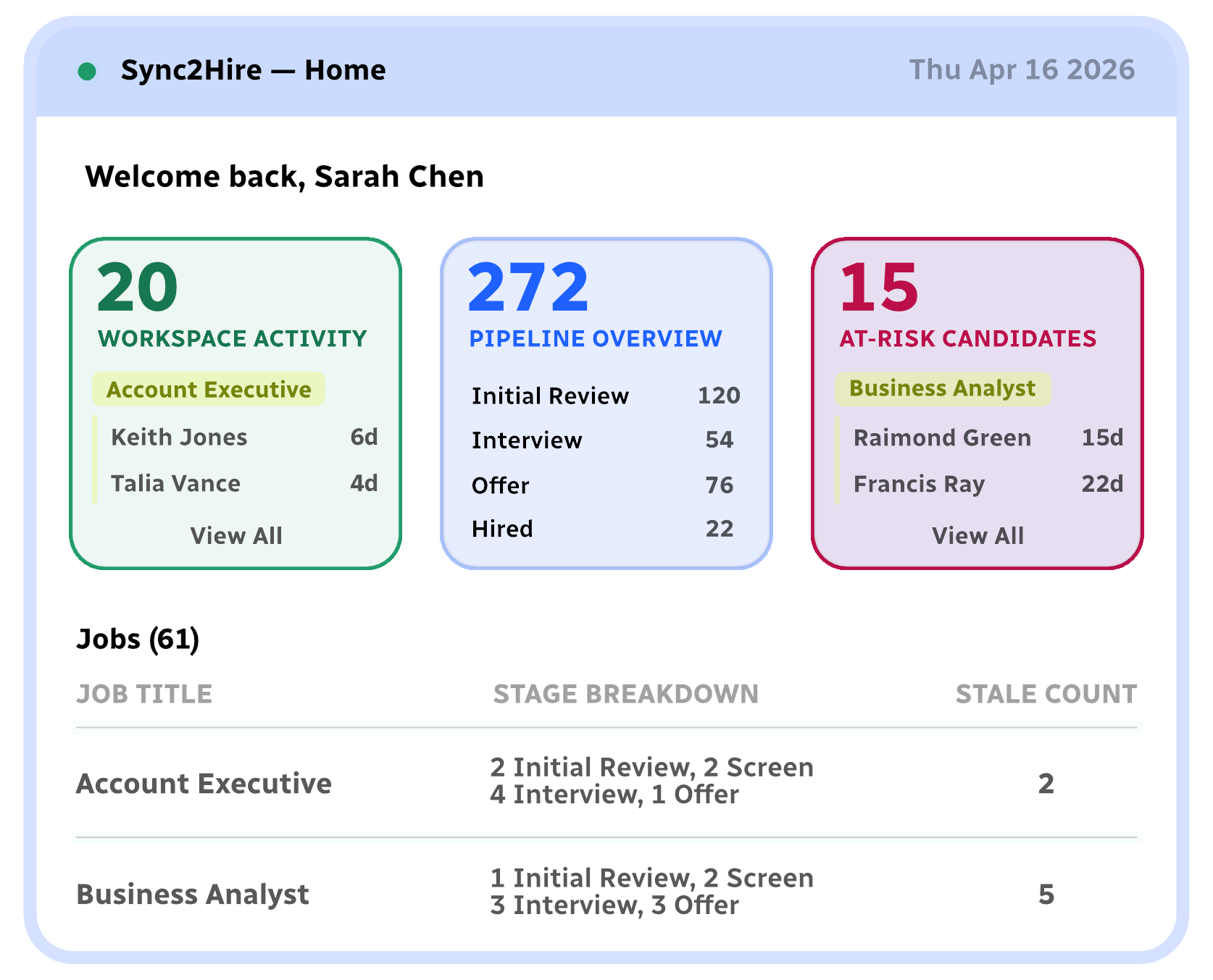 The moment you open Sync2Hire, Sync AI surfaces the state of every open role — workspace activity, full pipeline overview, and a live count of at-risk candidates going stale. No clicking into each job. No manual status updates. One view, everything visible.
