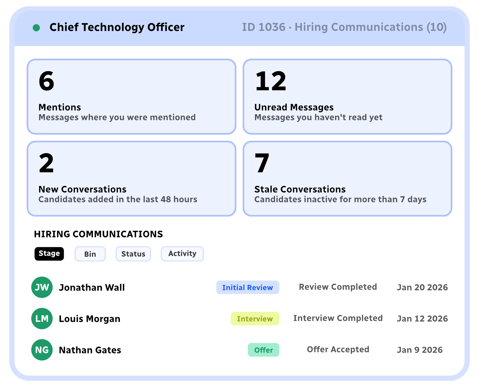 Each job in Sync2Hire has its own intelligence layer: unread messages, mentions, new conversations, and a live stale count. Sync AI flags roles where activity is dropping or candidates are aging so your team always knows where to focus — before a role quietly falls apart.