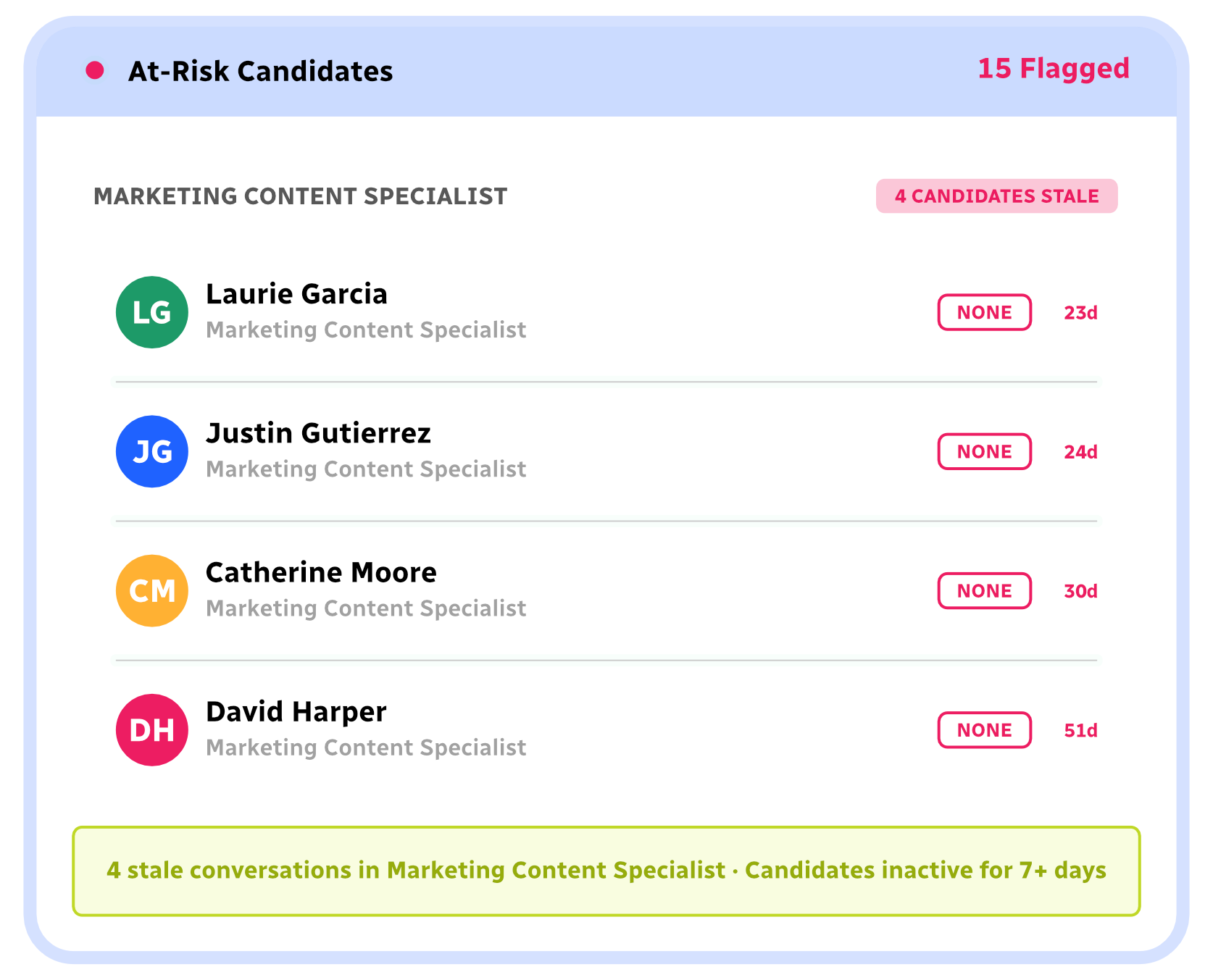 Sync AI continuously monitors every candidate's activity across your pipeline. When candidates go inactive — whether they're stuck in a stage, unreviewed, or simply forgotten — they surface in the At-Risk dashboard immediately. 100 candidates flagged means 100 chances to act before it's too late.