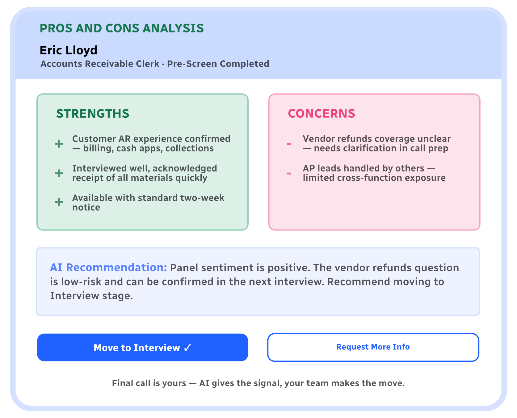 Pros and Cons Analysis synthesizes everything said across the hiring channel into a structured strengths-and-concerns breakdown — with an AI recommendation at the bottom. All the signal your team needs to move fast and with confidence. The final call is always yours.