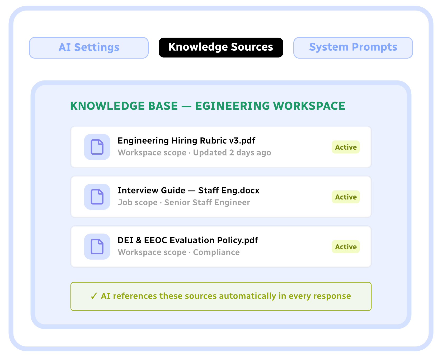 Drop in your evaluation rubrics, interview guides, or compliance policies. Sync AI scopes each document to the right workspace or job — so AI answers stay consistent, role-specific, and always grounded in your own standards rather than generic advice.